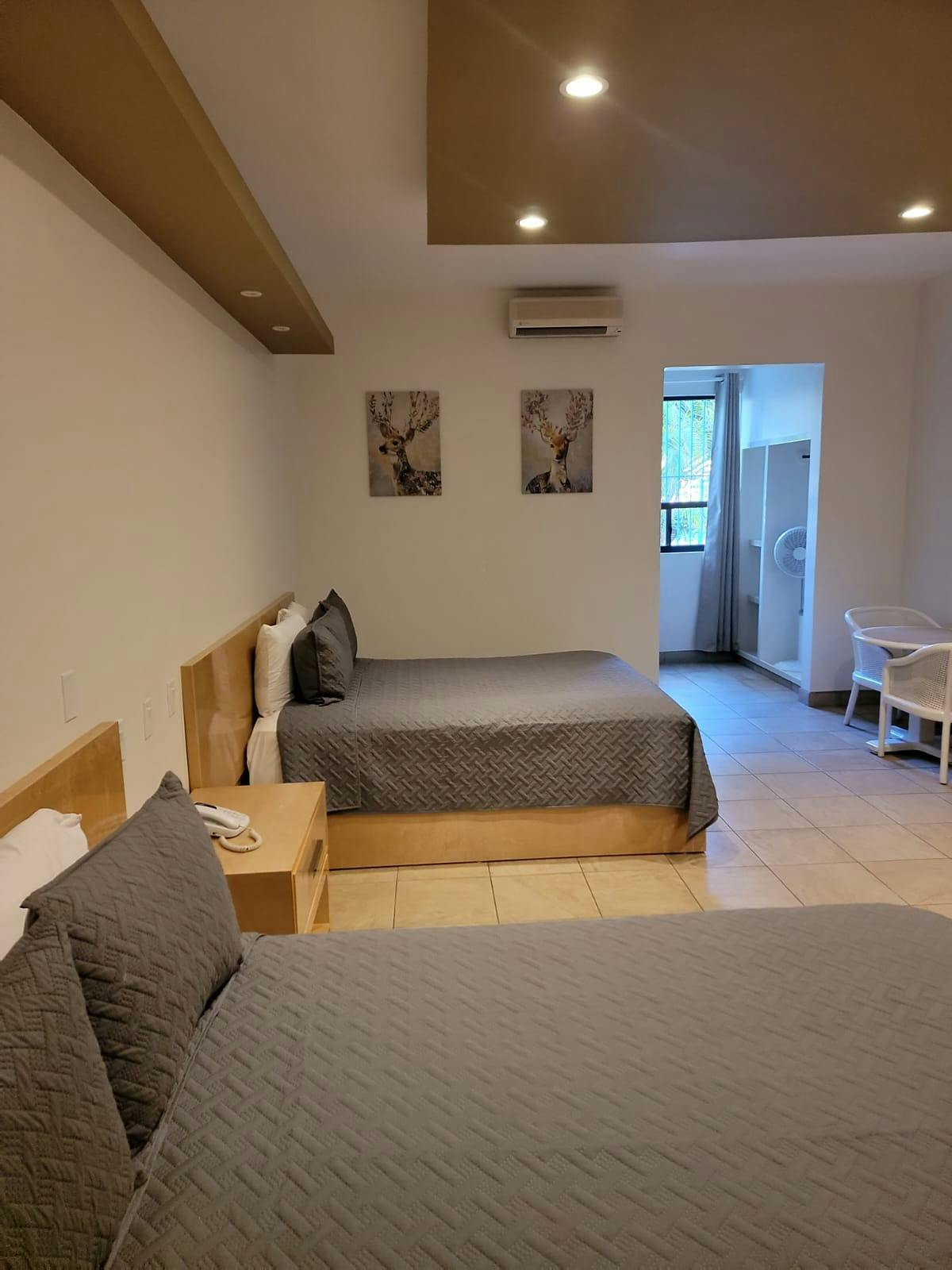 Grandes chambres avec deux lits queen size, avec leur placard, salle de bain et lavabo séparé.